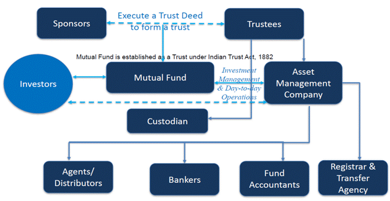 In India, mutual funds have a three-tier structure: the Sponsor, who starts the fund, the Trust and Trustees who oversee it, and the Asset Management Company (AMC), which manages the investments.